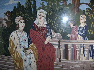 On an Austrian print, it depicts the meeting of Italian Renaissance poet Petrarch with his beloved Laura. The Gobelin was created around 1930 and it took 7 years to complete. This was one of the presents I received at my wedding, symbolizing eternal love.